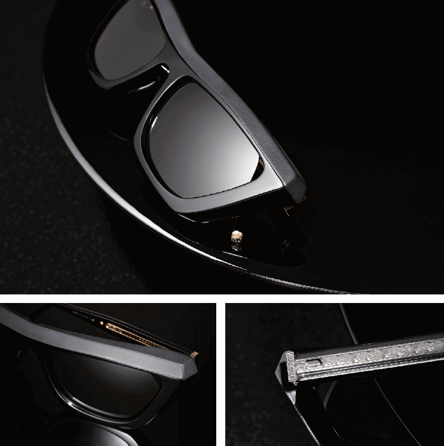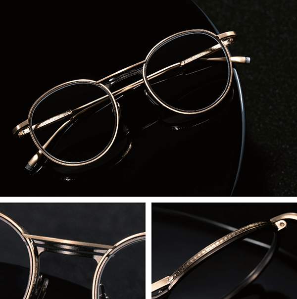 霧面醋酸纖維搭配雙色鈦金屬框體更構出立體結構感,細緻的雕花為這款有未來感外型的眼鏡添上了微妙的蒸氣龐克。