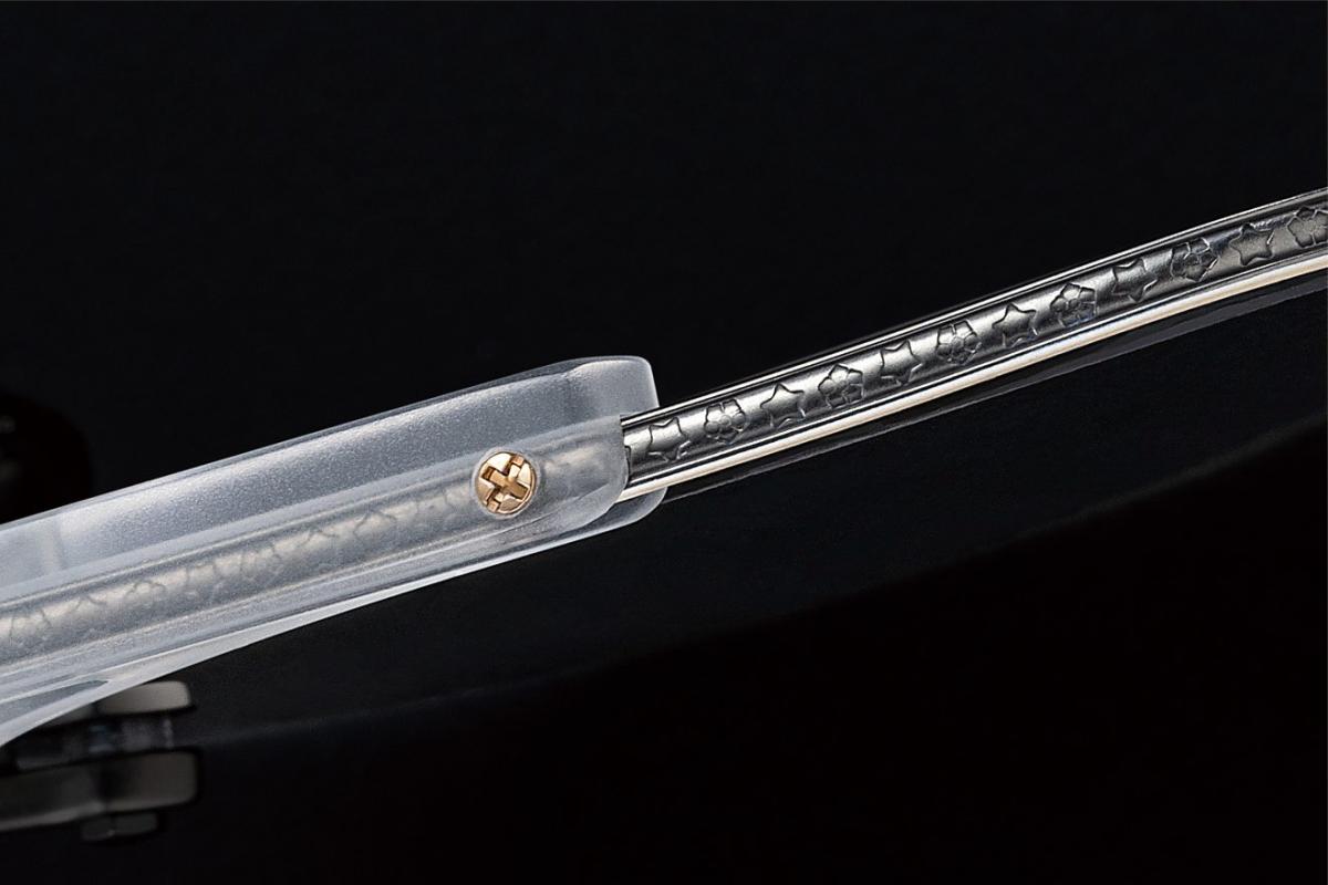 全新的鏡腿設計,以 19 世紀流行的長柄鏡為主題。 六角柱型精美雙面雕刻的蔓藤花紋增添了美麗的懷古元素。