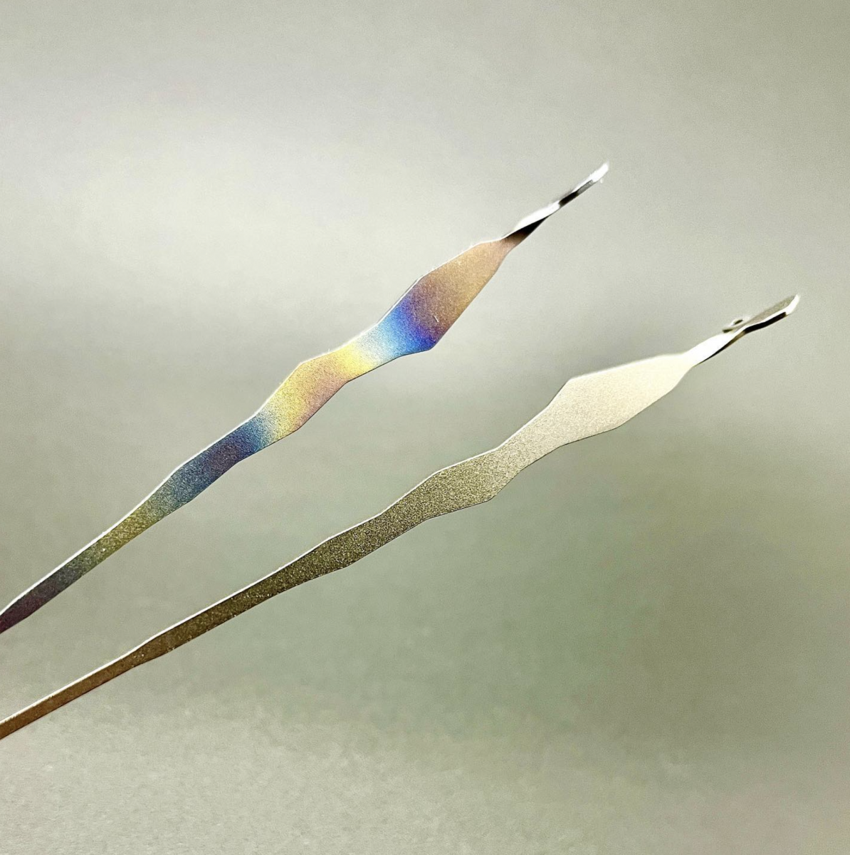 經年侵化系列眼鏡的鏡腿部分由β-鈦製成,經過拋光與金屬噴砂處理,使表面散發出獨特光澤。這種處理方式雖然會隨時間產生氧化現象,但正因如此,每副眼鏡都展現出更加自然且獨特的手工質感。