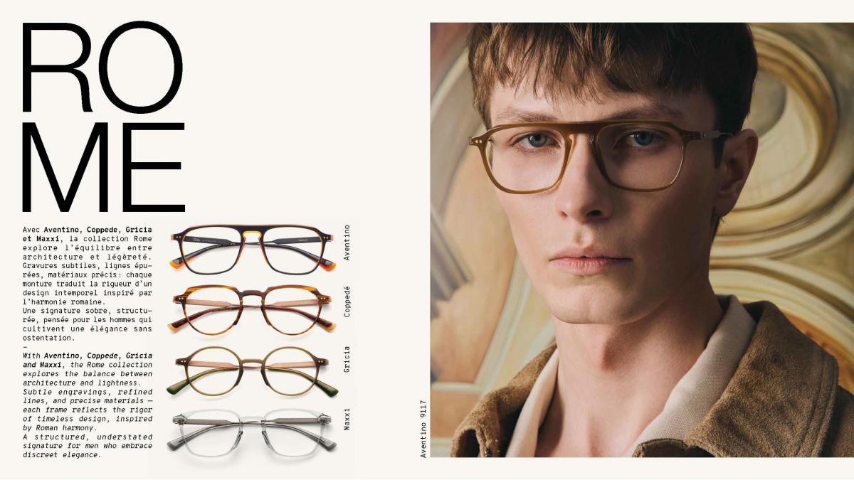 Rome 系列包含 AventinoCoppedéGriciaMaxxi 等款式,設計主題是「在建築感與輕盈之間找到平衡」。你可以在這些鏡框上看到非常細膩的雕刻、極簡俐落的輪廓,以及對比例與結構的精準掌握。