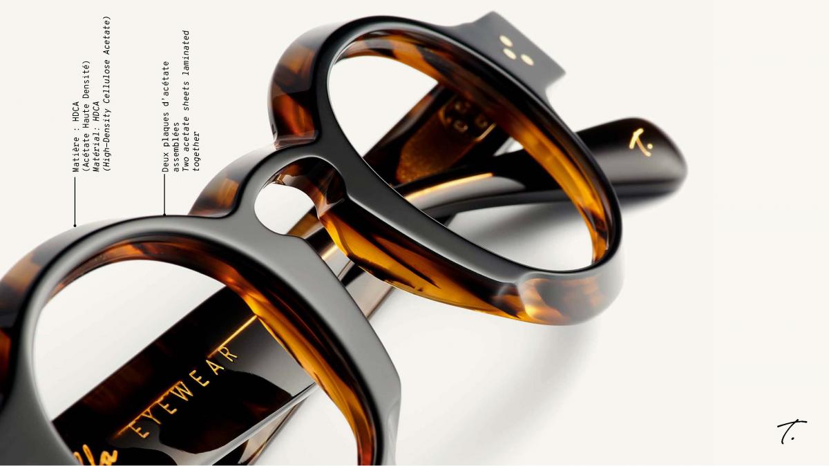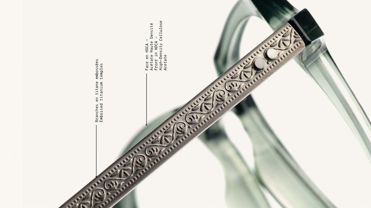 主要採用壓紋鈦金屬鏡腿(embossed titanium temples)與 HDCA 高密度醋酸纖維前框。部分款式由兩片醋酸板壓合而成,這樣的結構兼具視覺層次感、耐用性與舒適配戴體驗。壓紋設計與高密度材質結合,展現出經得起細看的工藝質感。
